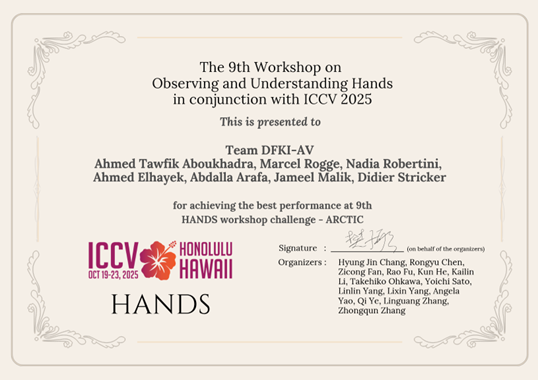 The AV-team consisting of Ahmed Tawfik Aboukhadra, Marcel Rogge, Nadia Robertini, Ahmed Elhayek, Abdalla Arafa, Jameel Malik, and Didier Stricker, has been awarded 1st place in the 9th “Observing and Understanding Hands” (ARCTIC) Workshop Challenge, held in conjunction with ICCV 2025. The team presented their winning solution during the workshop program on the 20th October 2025, showcasing their innovative approach to bimanual hand–object reconstruction.