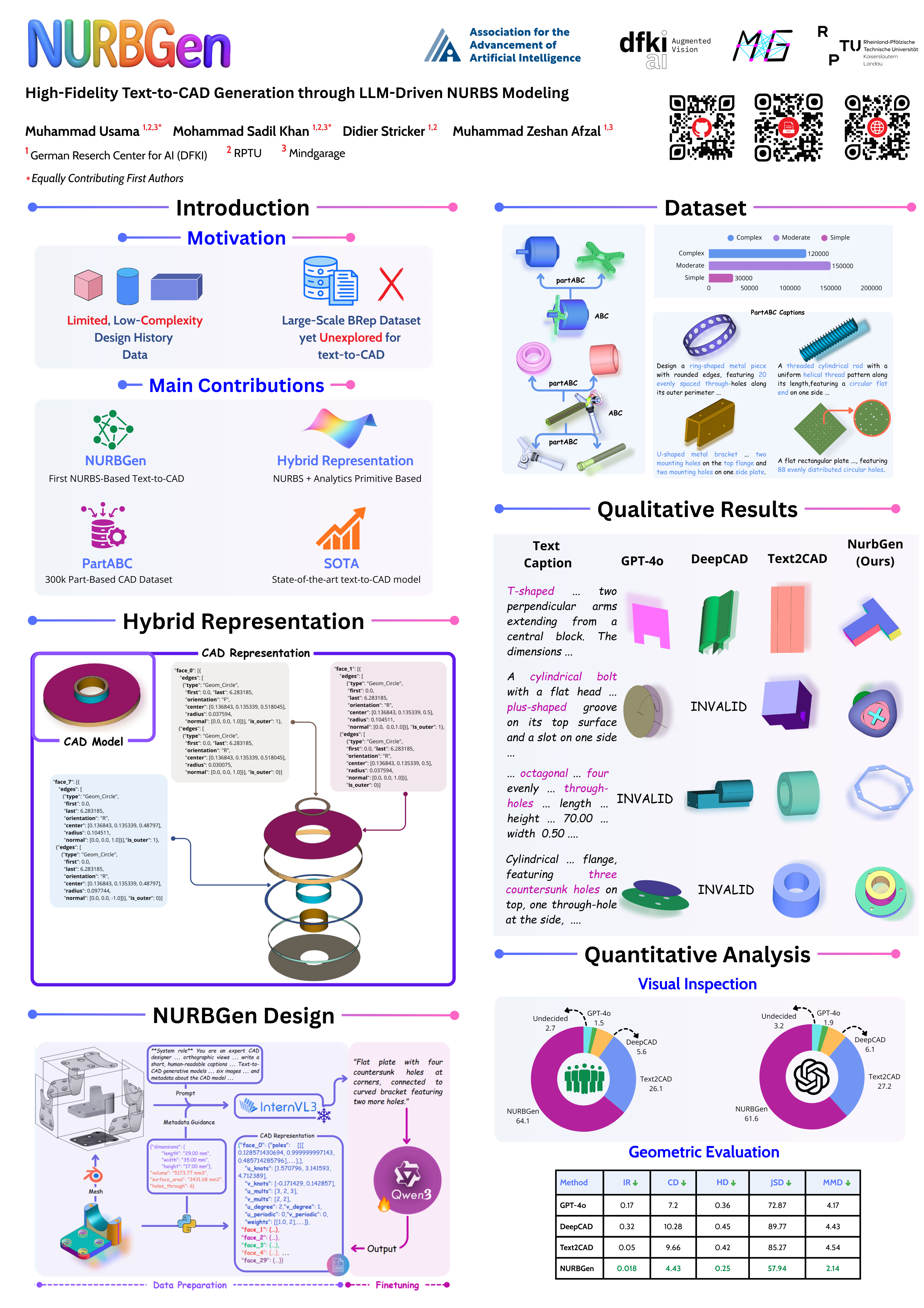 We are glad to announce that our paper, NURBGen: High-Fidelity Text-to-CAD Generation through LLM-Driven NURBS Modeling, has been accepted at the Fortieth AAAI Conference on Artificial Intelligence (AAAI) 2026 Singapore. Co-led by Muhammad Sadil Khan and Muhammad Usama under the supervision of Didier Stricker and Muhammad Zeshan Afzal, our research introduces the first framework to generate high-fidelity, editable 3D CAD models directly from text by fine-tuning a large language model to produce structured NURBS surface parameters. To overcome the limitations of existing mesh-based or design-history systems, we propose a hybrid symbolic representation that combines untrimmed NURBS with analytic primitives to robustly handle trimmed surfaces and degenerate regions while maintaining token efficiency. Evaluated on our new partABC dataset of 300k annotated CAD components, NURBGen demonstrates strong performance in geometric fidelity and dimensional accuracy, as confirmed by expert evaluations.